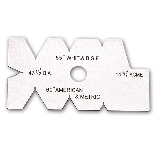 The gauge clearly indicates 55° for Whitworth and BSF Threads; 47-1/2° for BA Threads, 60° for Metric and American National Threads and 14-1/2° for Acme threads.