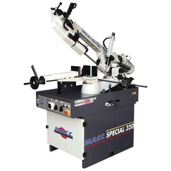 MACC BANDSAW, 230MM CAP, SWIVEL HEAD, RH MITRE, 2 SPEED 415V 3PH, HYD DOWNFEED