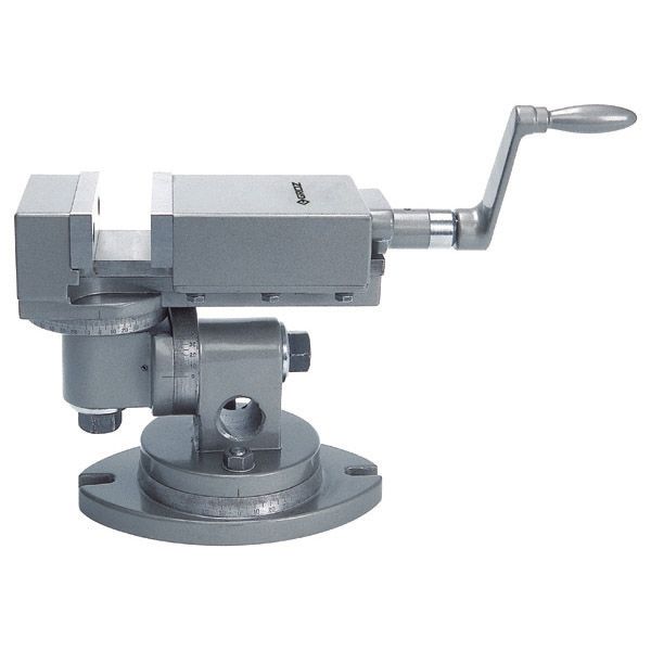 The vice has one fixed horizontal axis which allows the workpiece to be rotated at any angle. Fully graduated 360° swivel base allows complete rotation along the vertical axis. The third angular slide with a moving axis allows for any setting in the 3D plane.