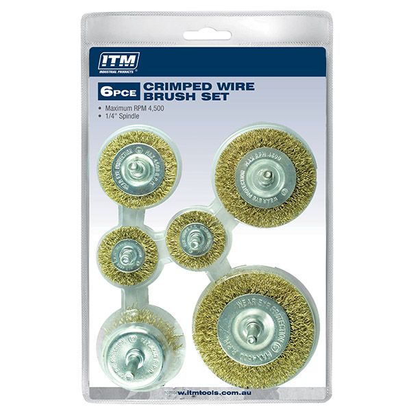 ITM CRIMP WIRE WHEEL BRUSH KIT 6PCE INCLUDES: 40MM X 2, 50MM, 63MM, 75MM AND 50MM CUP BRUSH