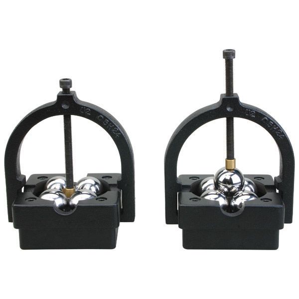 Vee Block bases are made from cast iron and use hardened 60HRC wear resistant balls with sphericity controlled to within 0.000025" (0.6microns) on the small and medium sets and 0.00005" (1.27 microns) on the large set. Balls are finished to 0.2 microinches.