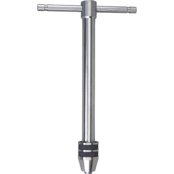 Ratchet handle can be set for right or left hand operation or locked for non ratchet use. Self centring powder metallurgy hardened jaws and knurled chuck sleeve provide positive grip on taps, reamers and small tools Sliding T "" Handle for fitting into tight spaces with greater leverage.