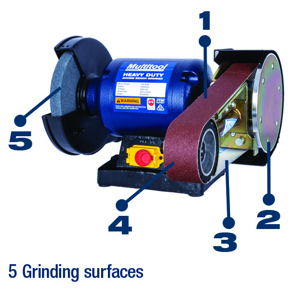 Combine the robust PO200HD MULTITOOL 200mm Bench Grinder with one of Australia's leading belt grinding attachments PO362.